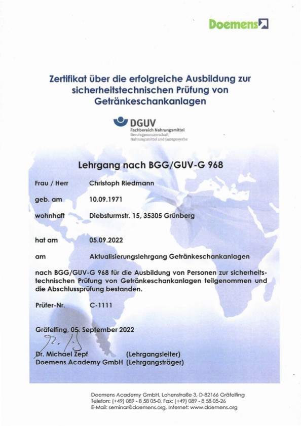 Teilnehmer: Christoph Riedmann. Zertifikat über die erfolgreiche Ausbildung zur sicherheitstechnischen Prüfung von Getränkeschankanlagen